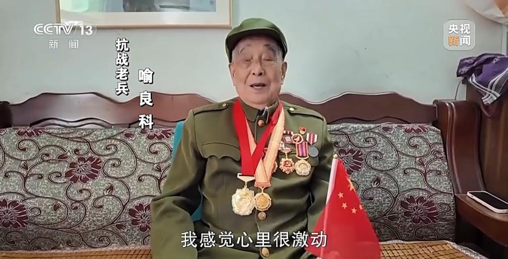 抗战老兵 喻良科:我们 现在繁荣富强了,现在装备这么多,我感觉心里很激动,现在激动得连话都说不出来了。