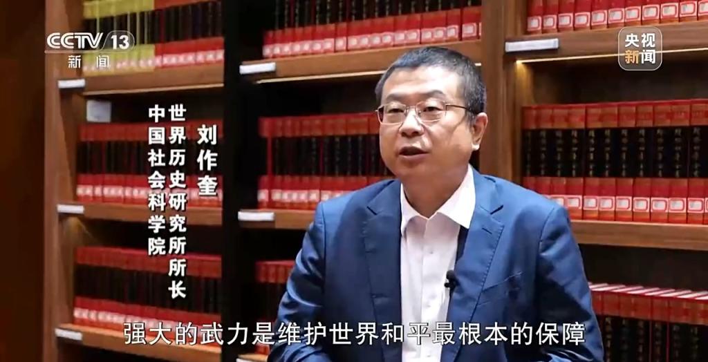 中国社会科学院世界历史研究所所长 刘作奎:以武止戈,强大的武力是维护世界和平最根本的保障,只有自己强大,自己有了底气,和平才能得到维护,所以这次阅兵向世界展示的就是,我们祖国强大了,我们发展了,但是我们牢记我们永远是维护世界和平的一支最重要的力量。